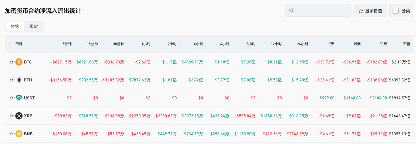 5、过往24小时内,BTC、ETH、USDT、XRP、BNB 等币种合约交易净流出领先,或存在交易机会;