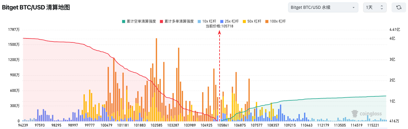 3、Bitget BTC/USDT当前价格 105,718 美元,区间多单清算密集,50x与100x高杠杆较为集中,若跌破此位,市场恐迎短线快速下探;