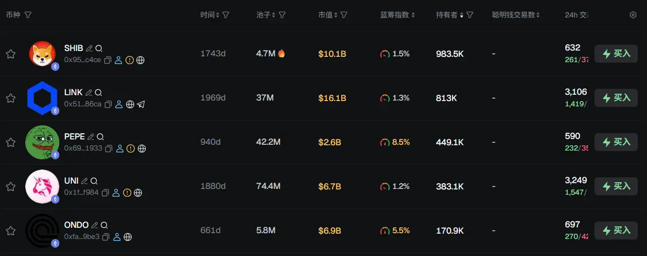 过去 24h ETH 热门代币前五依次为:SHIB、LINK、PEPE、UNI、ONDO