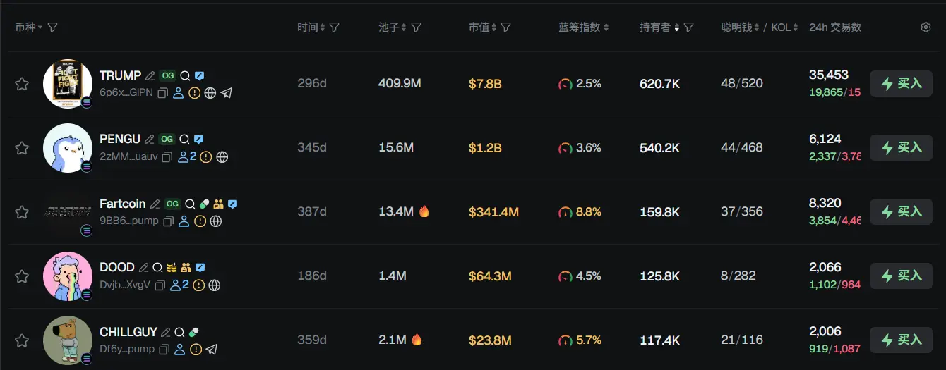过去 24h Solana 热门代币前五依次为:TRUMP、PENGU、Fartcoin、DOOD、CHILLGUY