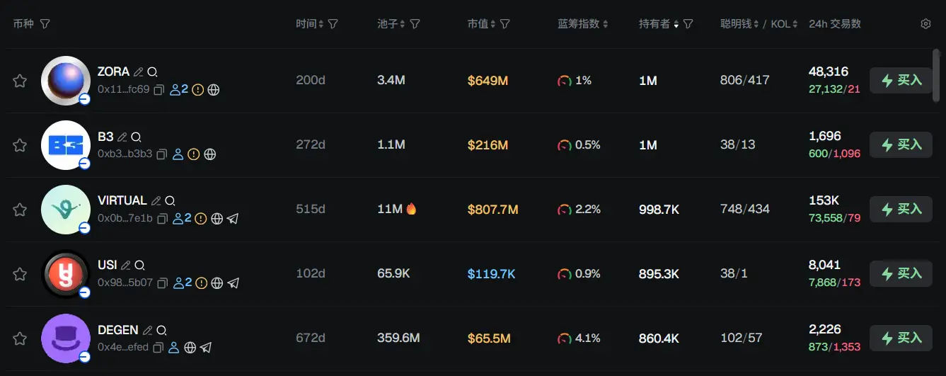过去 24h Base 热门代币前五依次为:ZORA、B3、VIRTUAL、USI、DEGEN