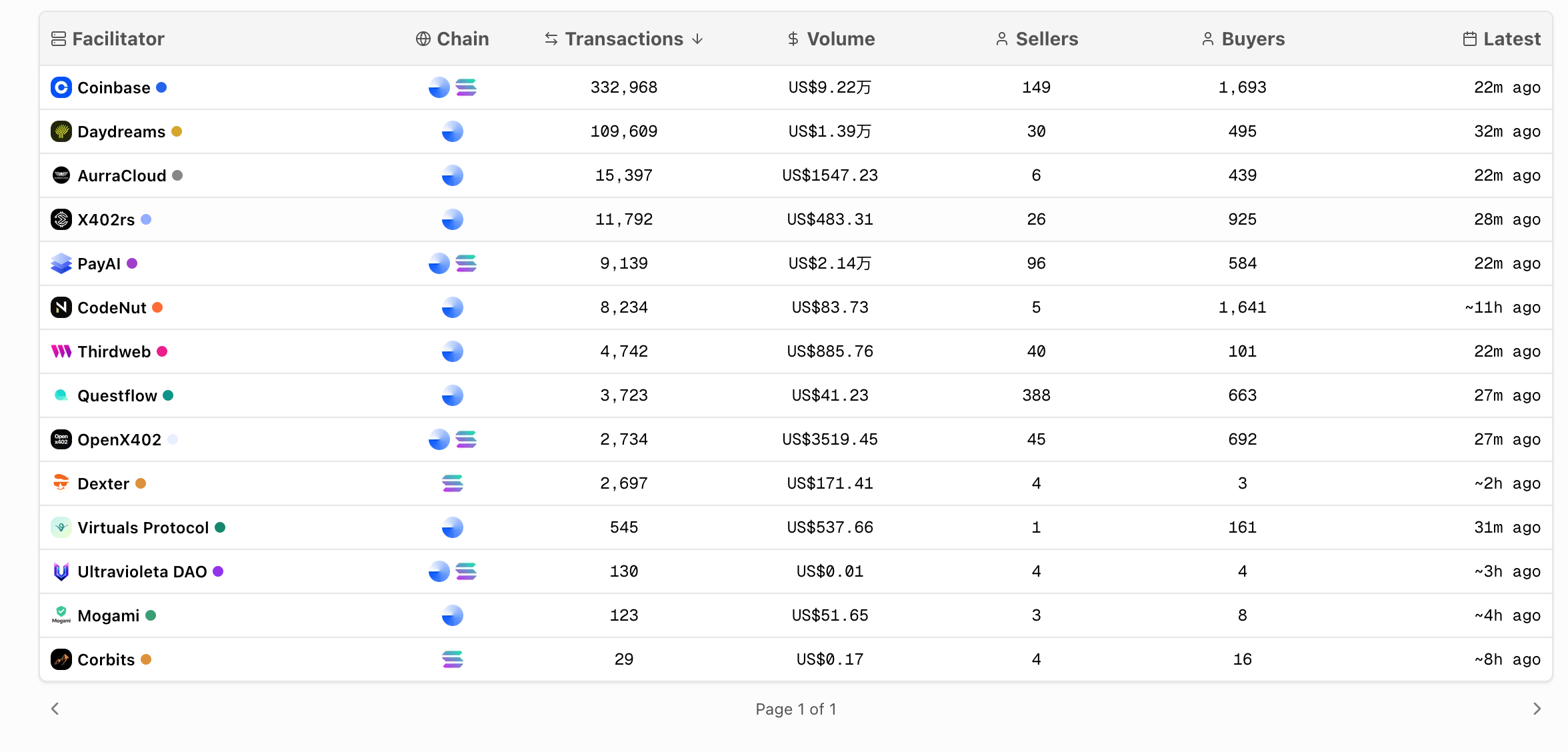 看看 x402 的 Facilitator 排行榜就知道现状有多尴尬。Coinbase 排第一,处理了 33 万笔交易。接下来是 Daydreams、AurraCloud、PayAI……清一色都在Base和Solana上。BSC?一个都没有。