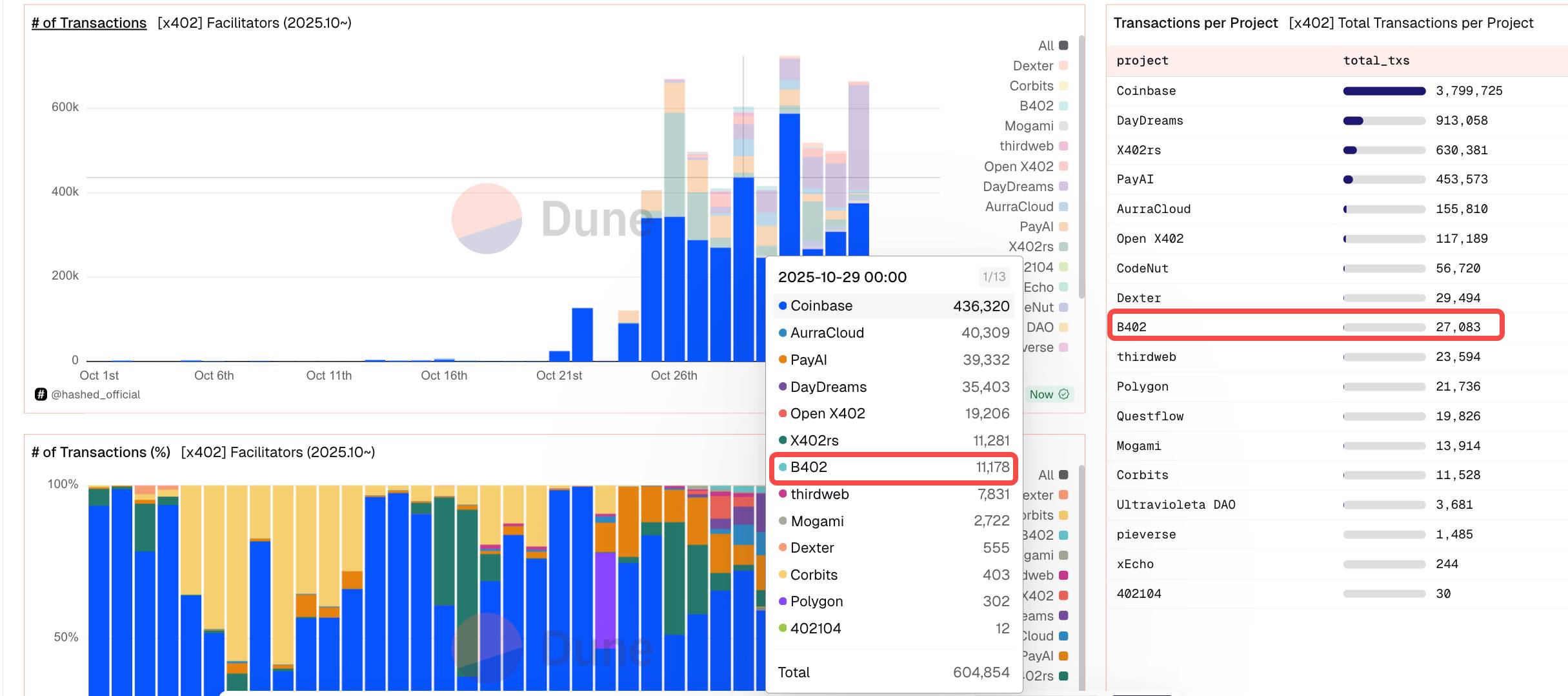 这种极度集中其实反映了一个问题:目前 x402 生态严重依赖 Coinbase 和 USDC。而 b402 支持多币种的设计,恰好可以打破这种垄断。