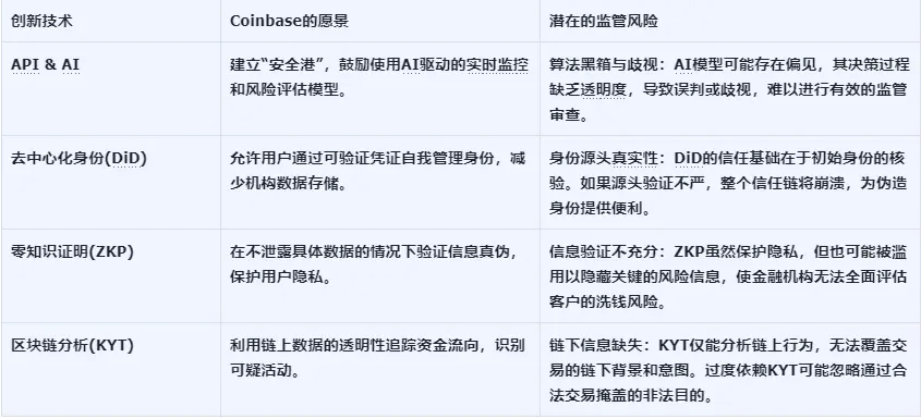 Coinbase 的提案主要围绕四大技术创新展开:应用编程接口(API)、人工智能(AI)、去中心化身份(DiD)与零知识证明(ZKP),以及基于区块链的交易分析(KYT)。其核心诉求是为采用这些创新技术的金融机构设立「监管安全港」(Regulatory Safe Harbors),以减轻其合规负担并鼓励技术应用。