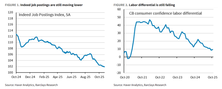 劳动力市场方面,包括 Indeed 招聘职位和劳动差额(jobs plentiful vs hard to get)在内的先行指标均显示需求正在放缓。