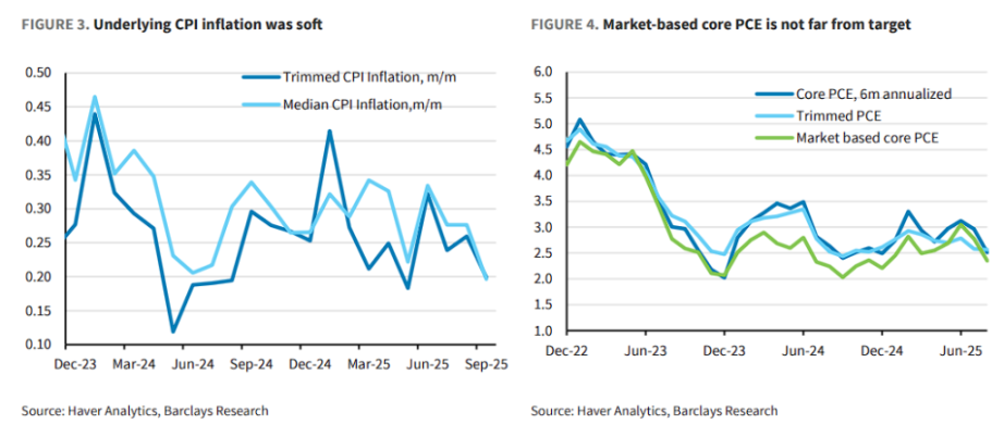 在通胀方面,鲍威尔也承认近期数据疲软。核心通胀指标已显露下行趋势。巴克莱分析认为,一旦剔除关税影响,市场基础的核心 PCE 通胀已接近 2% 的目标。