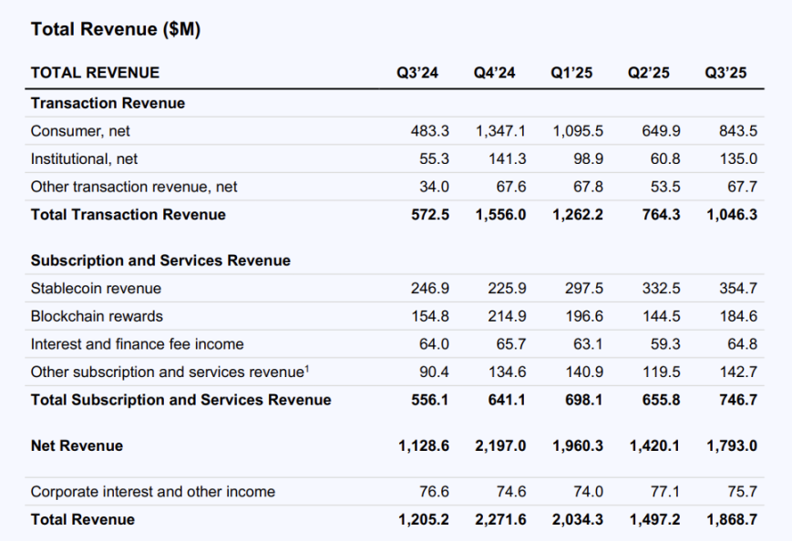 三季度总营收达 18.69 亿美元,环比增长 25%,核心驱动力来自交易业务复苏与订阅服务稳步增长。