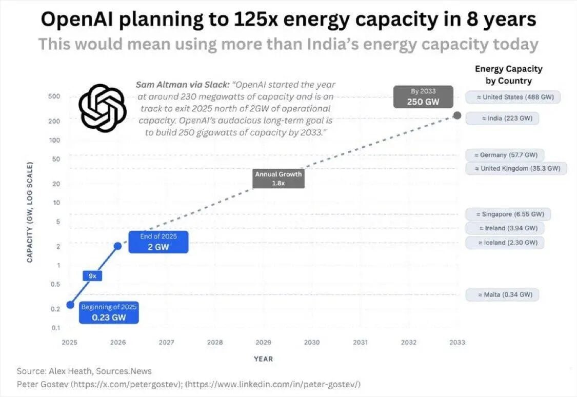 OpenAI 自己更是估计,到 2033 年其容量将达到 250 GW,这将是 2025 年底容量(2 GW)的 125 倍。
