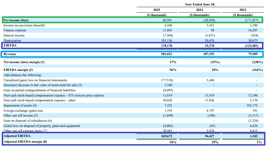 扭亏为盈与高增长:总收入同比增长 168% 达到 5.01 亿美元,净利润在 2024 年亏损后转正至 8700 万美元。其中,2025 财年第四季度是 IREN 首次报告季度盈利。