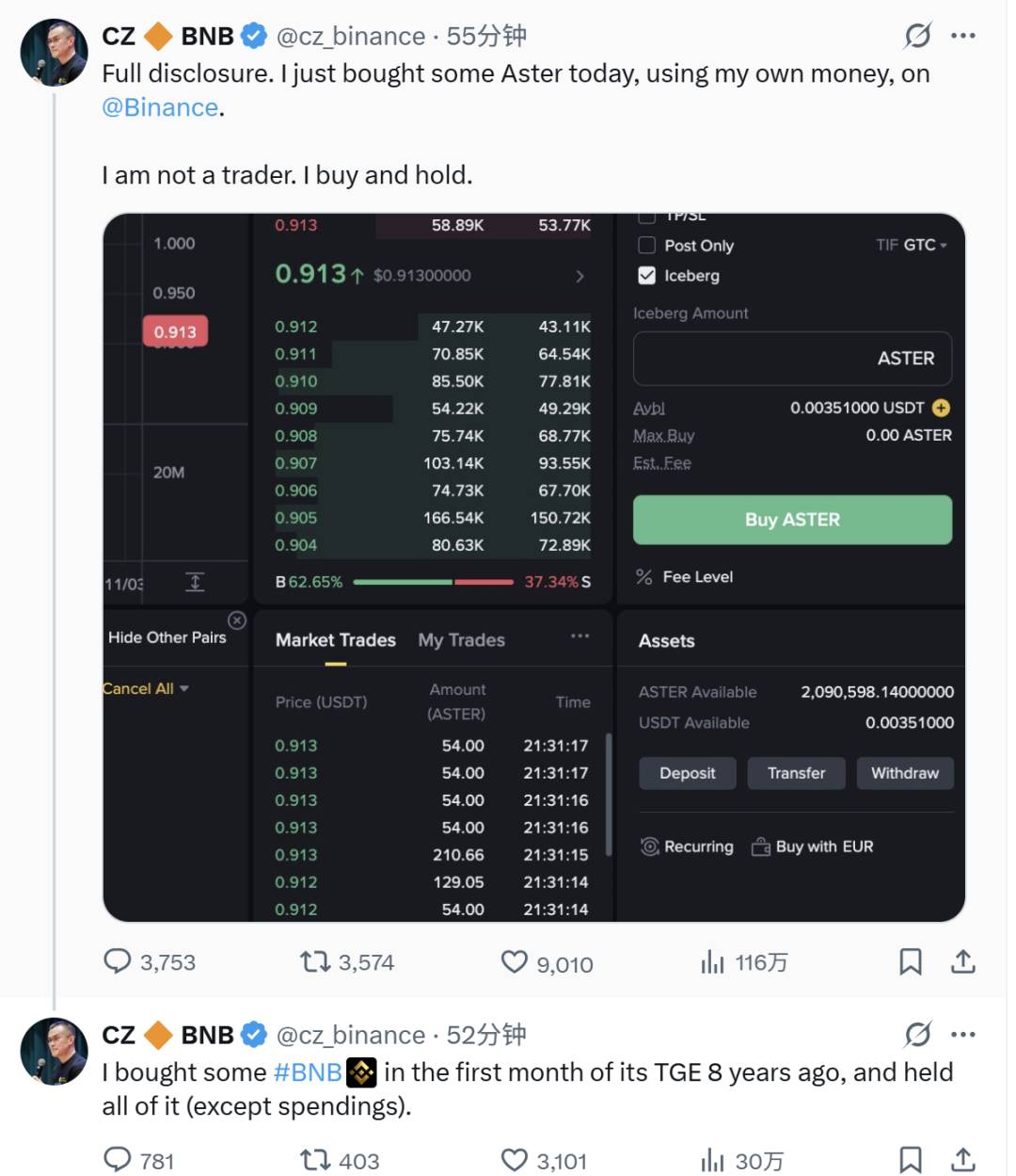 11 月 2 日晚,赵长鹏宣布用自己的钱购买了 209 万枚 Aster 代币,随后更是意味深长的连推表示「8 年前,我在 TGE 首月就购入了一些 BNB,并且一直持有至今(除用于消费的部分外)。」