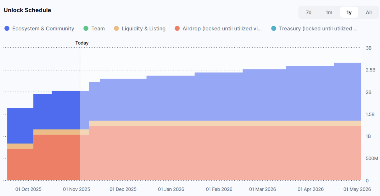 Aster 代币经济模型设计为渐进释放,总供应 80 亿枚。11 月,Aster 将迎来两次崖式解锁(cliff unlocks)。