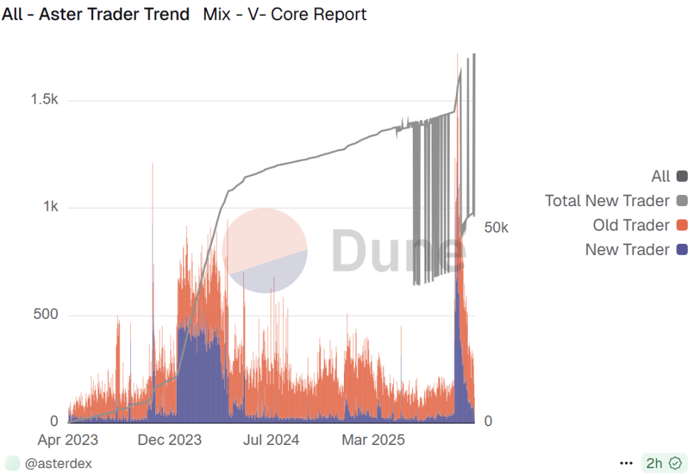 赵长鹏的喊单本质上是为 BNB Chain 生态产品“引流”,更多流动性流入 BNB Chain,刺激 Gas 费和 DeFi 活动。根据 Dune 最新数据显示,目前 Aster 的总用户数超 531.4 万,总 TVL 超 12.56 亿美元,总交易额更是达到夸张的 2.9 万亿美元。今年 9 月至 10 月份,大量新用户涌入其中,其单日增加数量甚至一度超 2024 年年初的牛市行情。