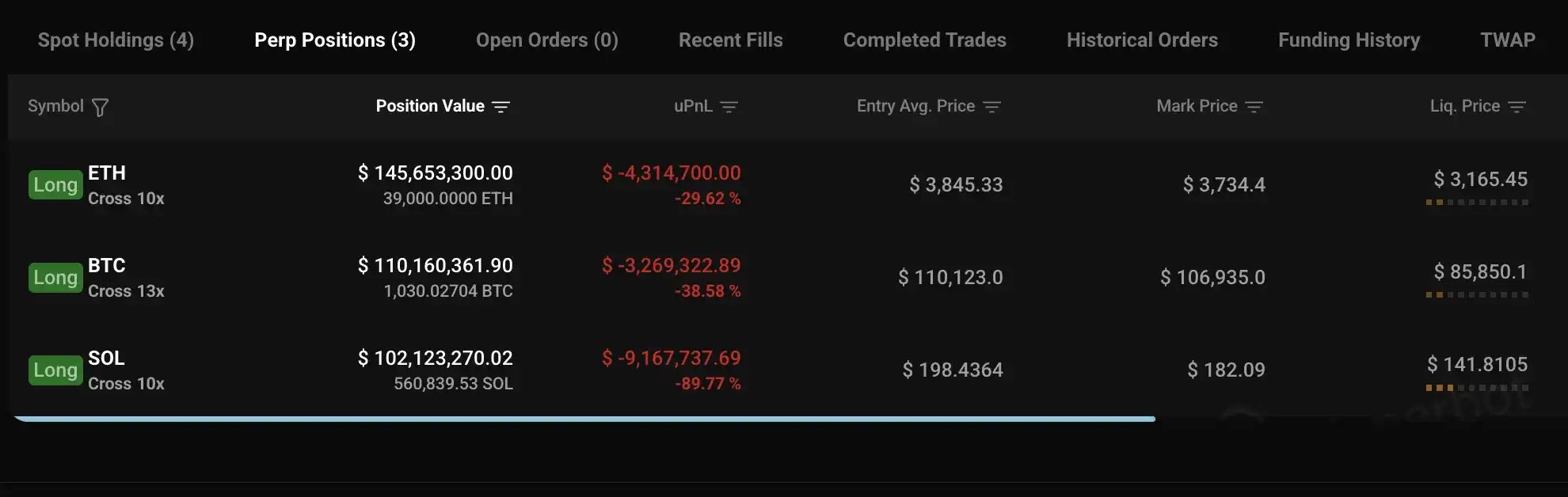 10 月 29 日,其平仓 BTC 多单,获利 140 万美元;彼时,其仍持有 ETH(5 倍杠杆)和 SOL(10 倍杠杆)多头仓位,价值 2.63 亿美元,浮亏 130 万美元;当天下午,其开始减仓 ETH 多单,先是减仓 3400 枚 ETH,获利 18.6 万美元;随后减仓 1.1 万枚 ETH,获利 61.8 万美元。最终,当天下午,其平仓 ETH 多单,累计获利 163.7 万美元;仅持有 SOL 多单,仓位价值 7421 万美元,浮亏 168 万美元。