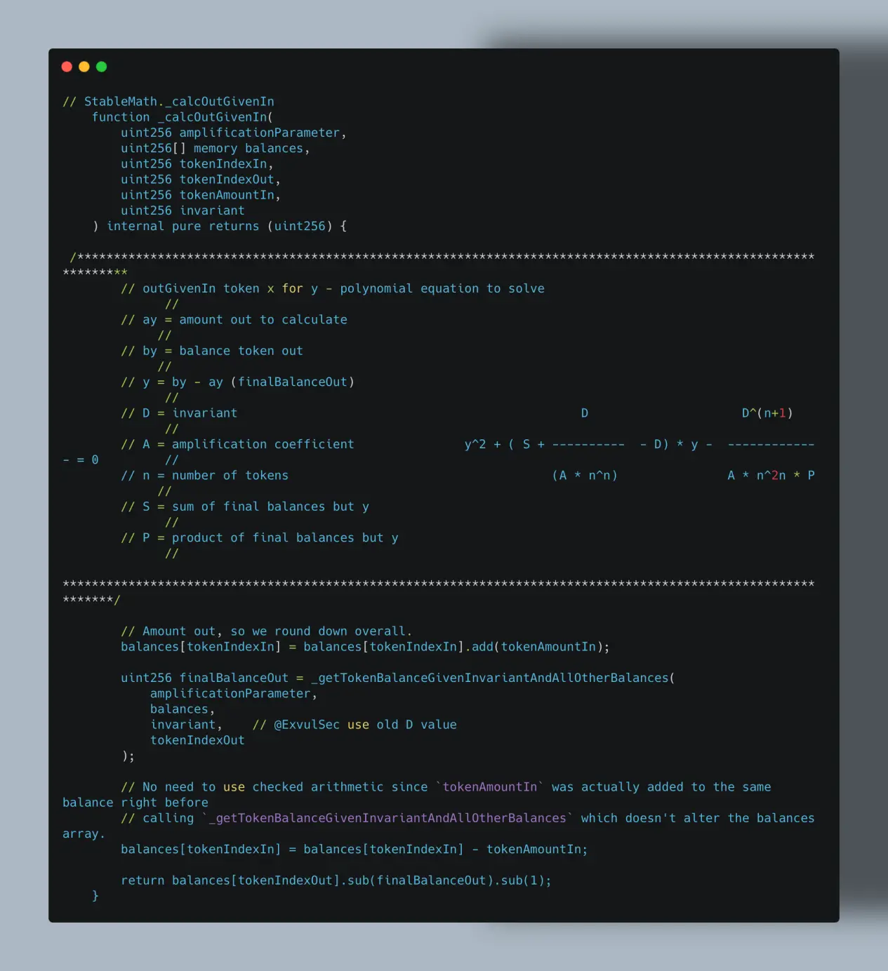2. 不变值计算对精度敏感:不变值 D 的计算依赖缩放后的 balances 数组,精度损失会直接传递到 D 的计算中,使 D 变小。