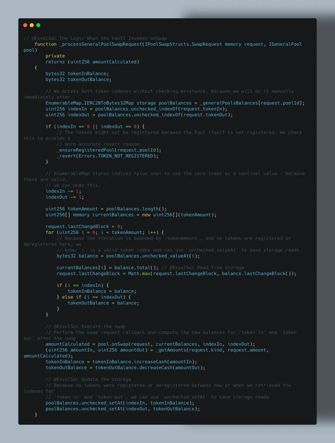 分析如上代码,虽然在每次调用onSwap时 Vault 都会创建新的currentBalances数组,但在 Batch Swap 中: