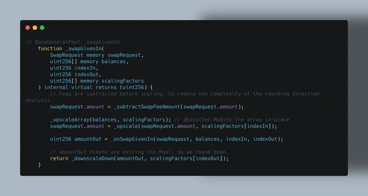 本次攻击的关键问题出在协议处理小额交易的逻辑上。当用户进行小金额交换时,协议会调用_upscaleArray函数,该函数使用mulDown进行数值向下舍入。一旦交易中的余额与输入金额同时处于特定舍入边界(例如 8-9 wei 区间),就会产生明显的相对精度误差。