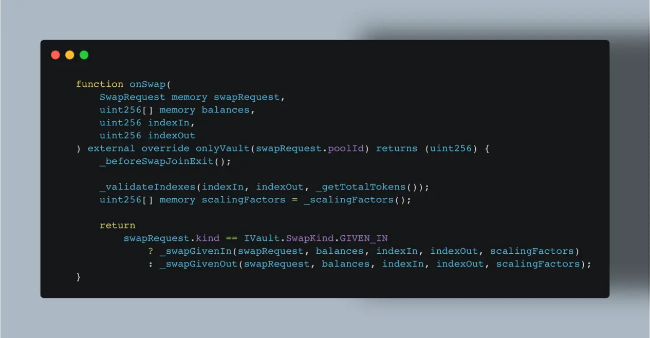 攻击的入口为 Balancer: Vault 合约,对应的入口函数为batchSwap函数,内部调用onSwap做代币兑换。