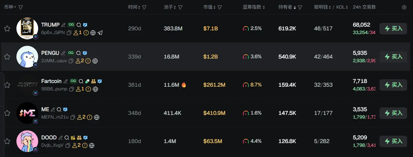 过去 24h Solana 热门代币前五依次为: TRUMP、PENGU、Fartcoin、ME、DOOD