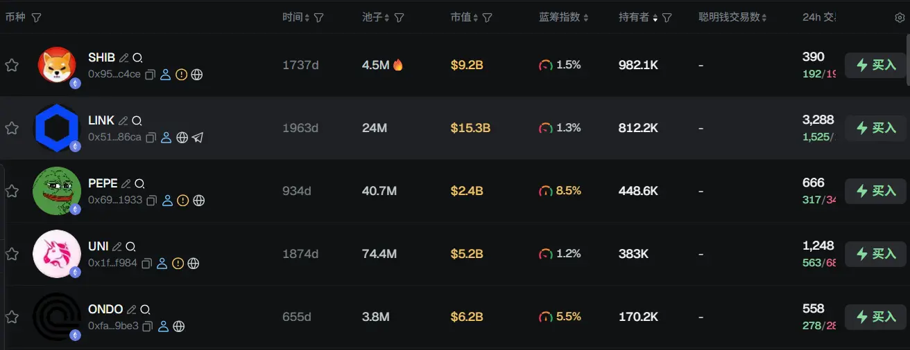 过去 24h ETH 热门代币前五依次为: SHIB、LINK、PEPE、UNI、ONDO