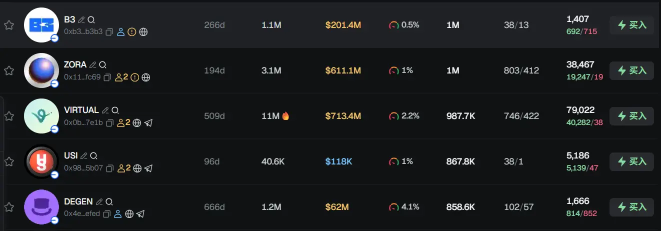 过去 24h Base 热门代币前五依次为: B3、ZORA 、 VIRTUAL 、USI、DEGEN