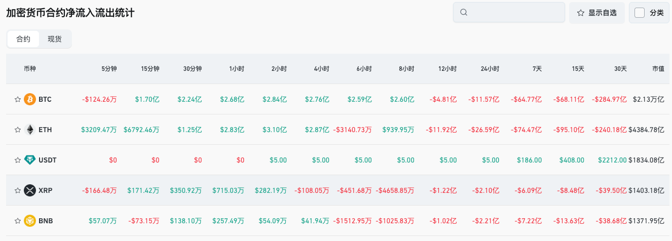 5、过往24小时内,BTC、ETH、USDT、XRP、BNB等币种合约交易净流出领先,或存在交易机会。