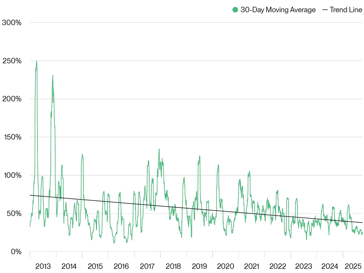 比特币当前的情况亦是如此。随着比特币的持有者从「早期爱好者」转向「机构投资者」,加之其技术不断成熟,如今的比特币已不再面临十年前那种「关乎生存的风险」,它已成为一种成熟的资产类别。这一点从比特币的波动率中可清晰看出 —— 自 2024 年 1 月比特币 ETF 开始交易以来,其波动率已大幅下降。
