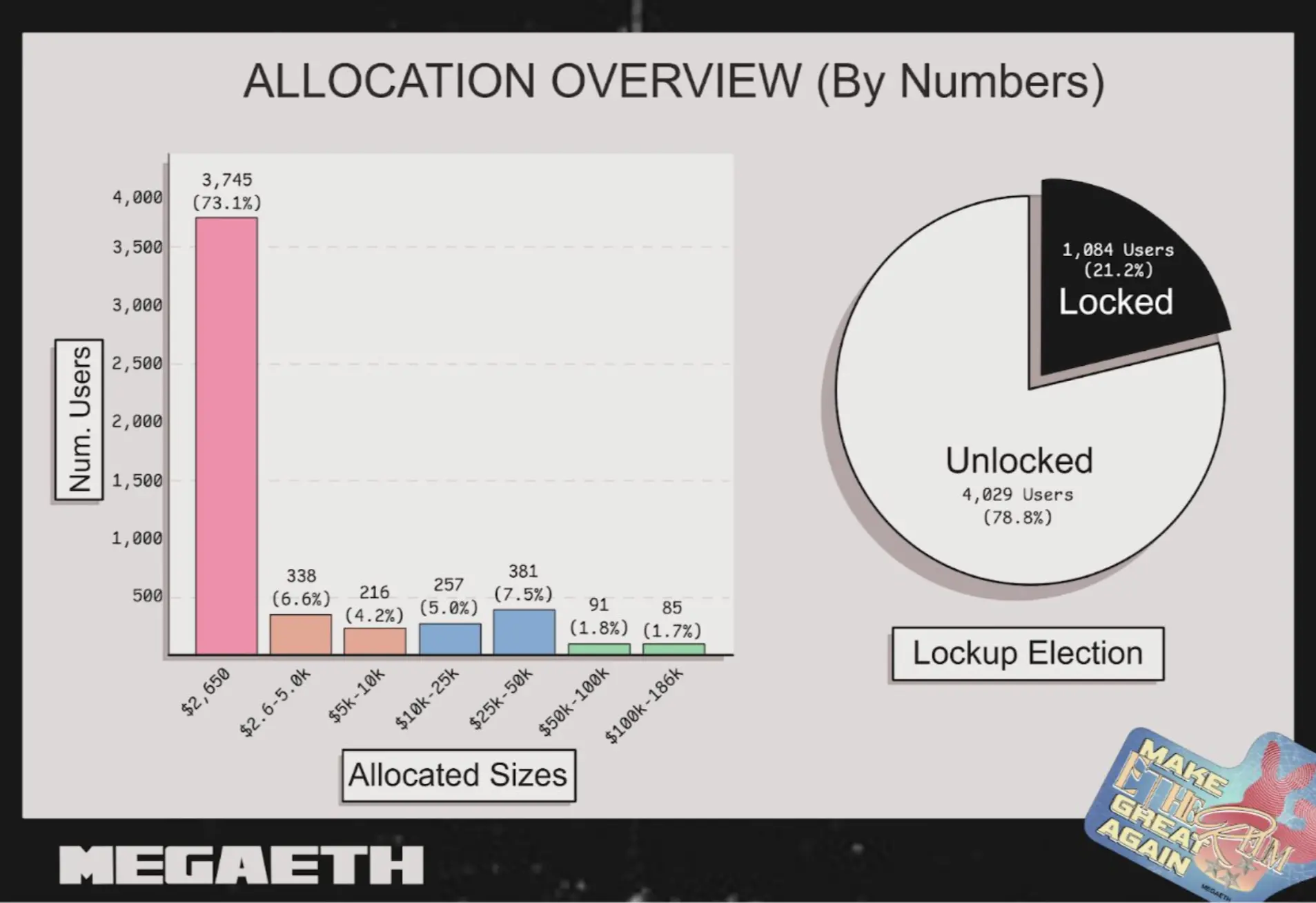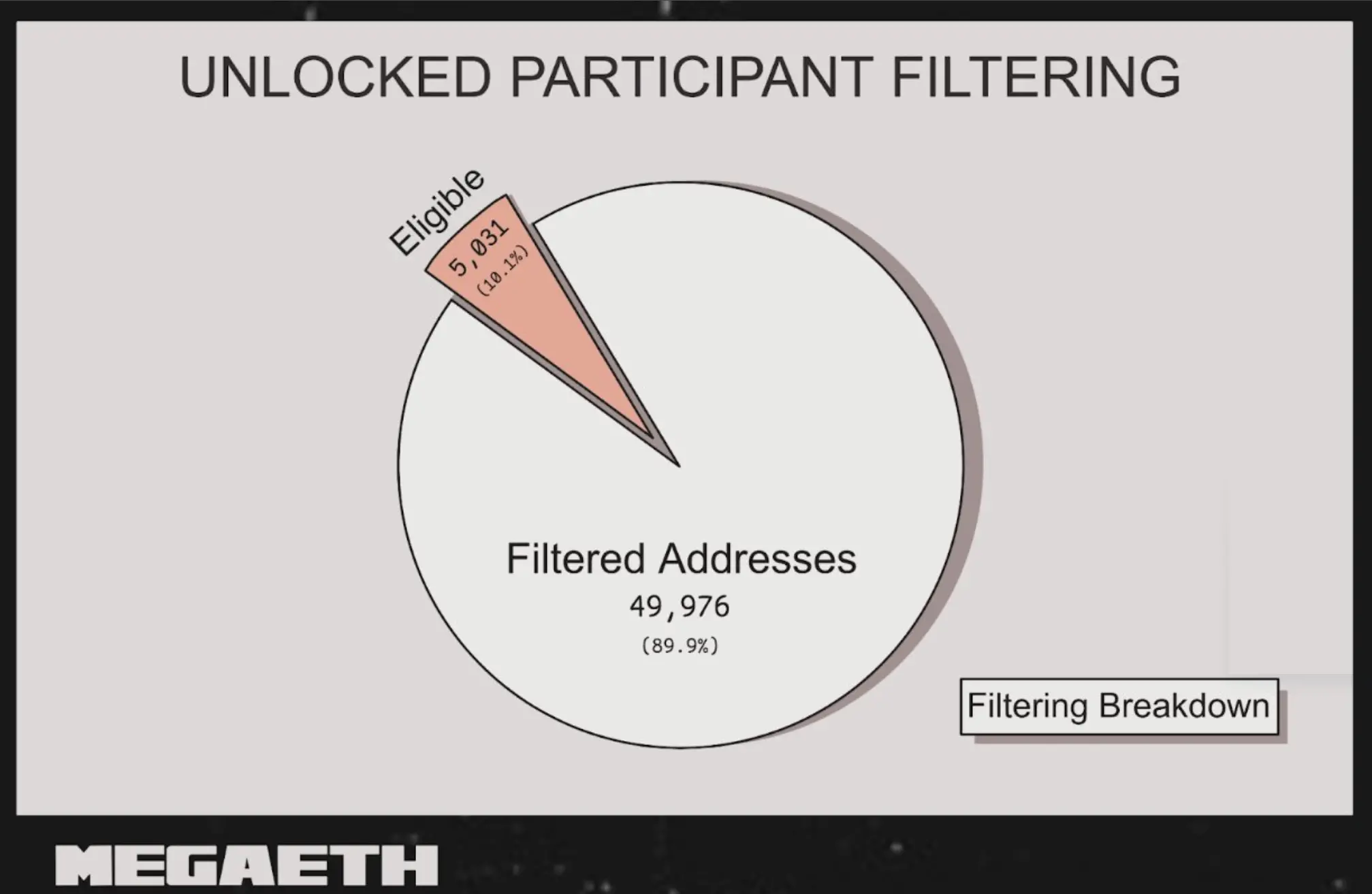 实际上,在 49,976 名未锁定参与者中,有 5,031 个钱包通过了此筛选,接受率约为 10.1%。通过筛选的地址之间的竞争非常激烈,即使是为了最低份额。我们相信算法会完成它的工作,并充分意识到有些人—即使有大量的 MegaETH 活动和持仓—如果他们的其他指标很弱,也无法入围。但这是一场公平的游戏,我们尊重结果。
