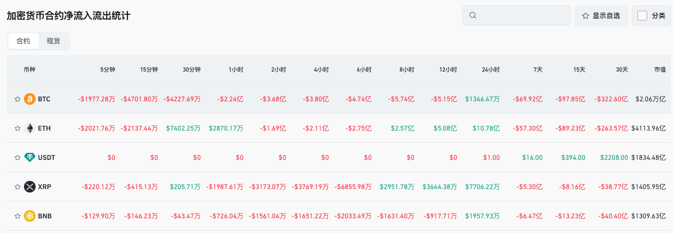 5、过往24小时内,BTC、ETH、USDT、XRP、BNB等合约交易净流出领先,或存在交易机会;
