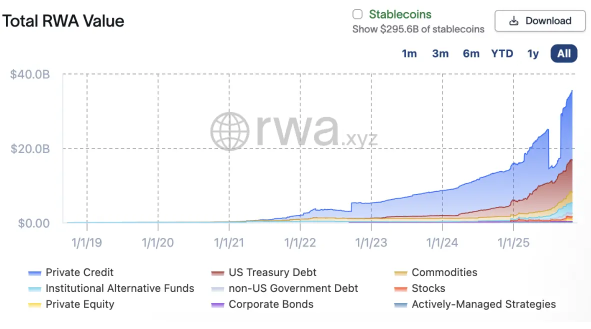 进入2025年以来,RWA——将房地产、债券、商品等传统资产代币化上链——正成为DeFi的“增量引擎”。据RWA.xyz统计,截至2025年10月31日,链上RWA总市值已超350亿美元,同比增长150%(是DeFi增长率的10倍)。麦肯锡预测,到2030年,RWA市场规模将达10万亿美元。