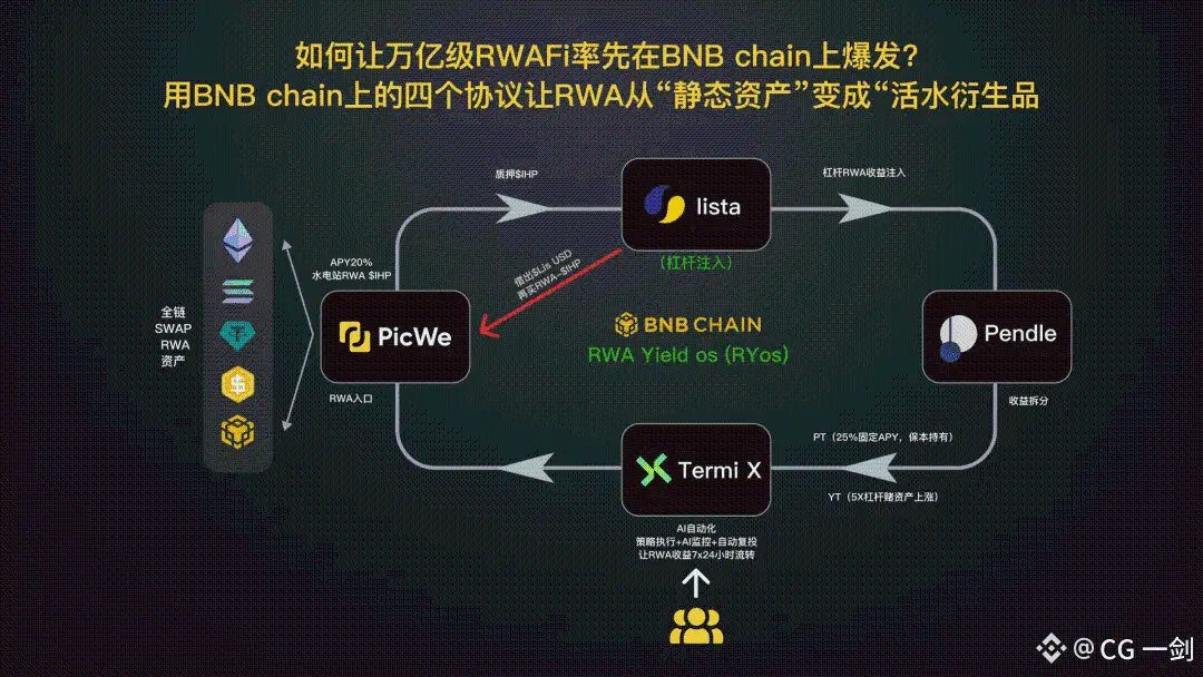 现在,我们将这些协议串联成一套“RWA Yield OS”,以PicWe的RWA资产为基础,通过Lista DAO进行杠杆放大,用Pendle对RWA资产进行PT/YT拆分,然后通过TermiX以自然语言驱动这套策略。目标是将RWA的稳健APY(如水电站RWA的20% APY),转化更高的复合收益,从而释放RWA资产的金融价值和可玩性,而且这套策略完全适用于DeFi从新手到专家不同阶段用户。