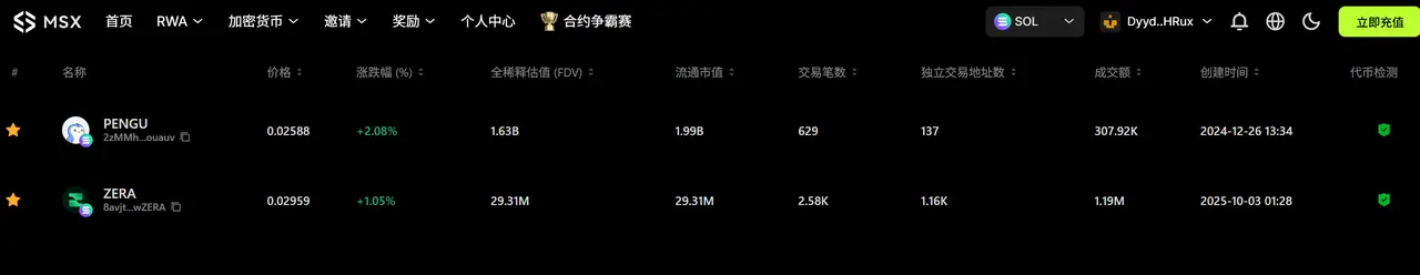 - 如果你当前登录的是 Solana 网络,MSX 会自动加载 Solana 上的主流代币与 Meme 资产(如 BONK、WIF 等),并显示基于 Solana 的现货与合约界面;