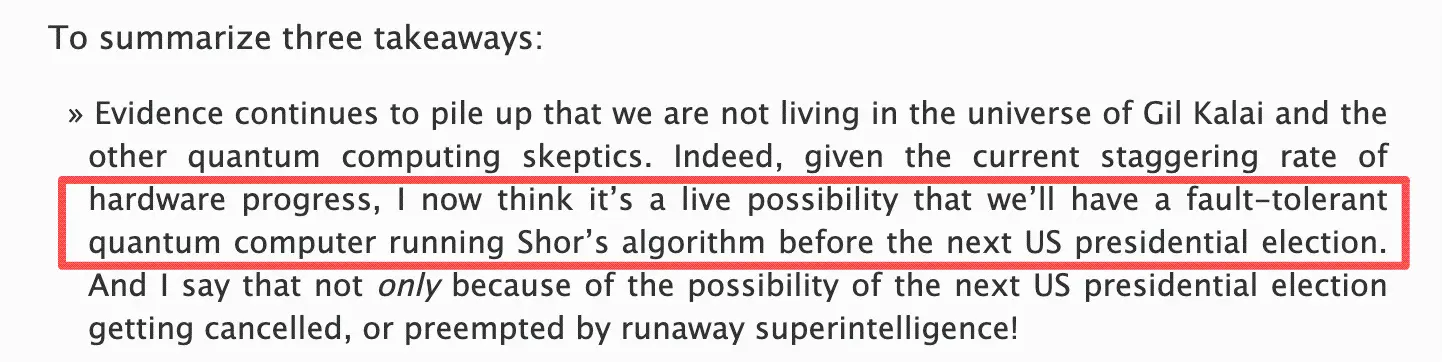首先是在 11 月 13 日,量子计算领域的大神、得克萨斯大学量子信息中心主任 Scott Aaronson 在其发表的一篇文章中提到:“我现在认为在下一次美国总统大选之前,我们有可能拥有一台能够运行 Shor 算法的容错量子计算机……”