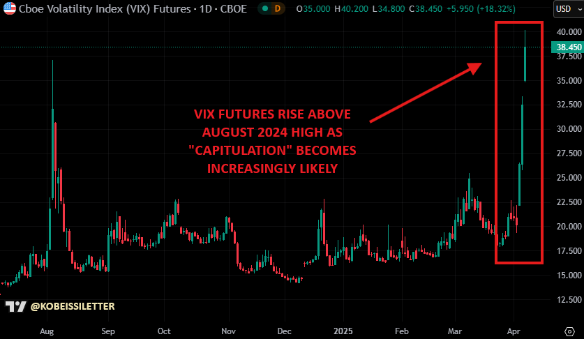 今天,波动率指数期货($VIX)飙升至高于 2024 年 8 月的峰值。