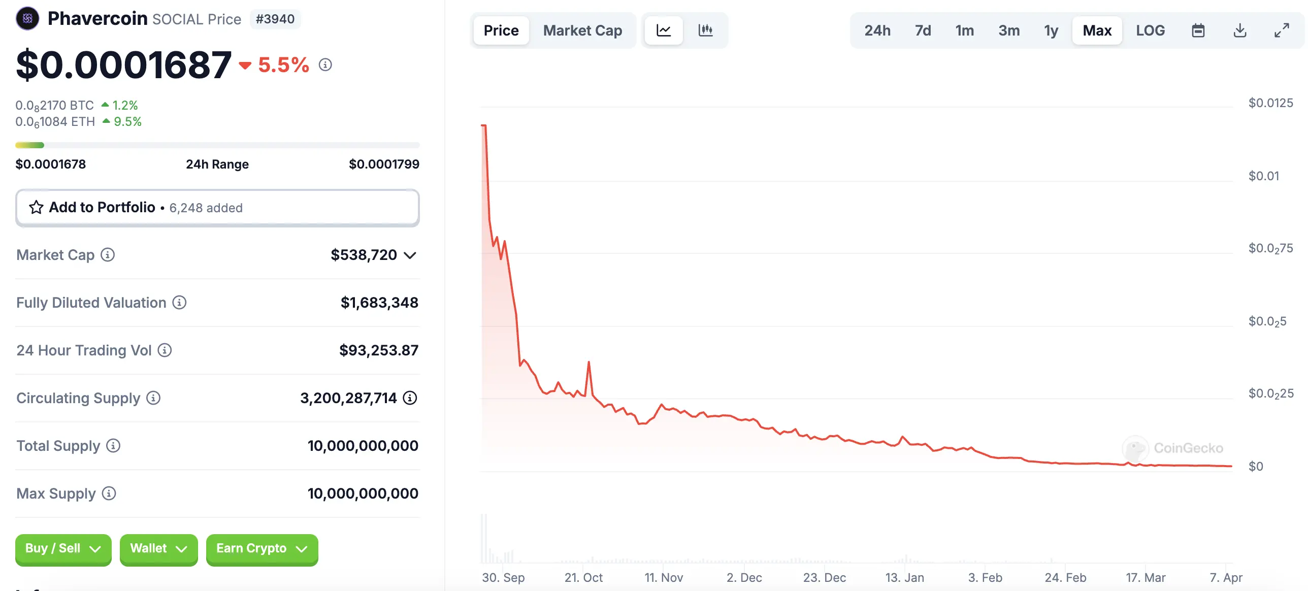 Phaver的移动应用已在今年 1 月停用。目前,其代币 SOCIAL 除了质押功能,几乎和Memecoin等同。
