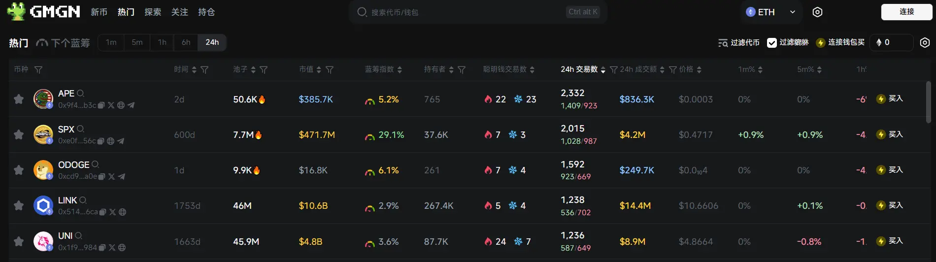 过去 24h 以太坊热门代币前五依次为:APE、SPX、ODOGE、LINK、UNI