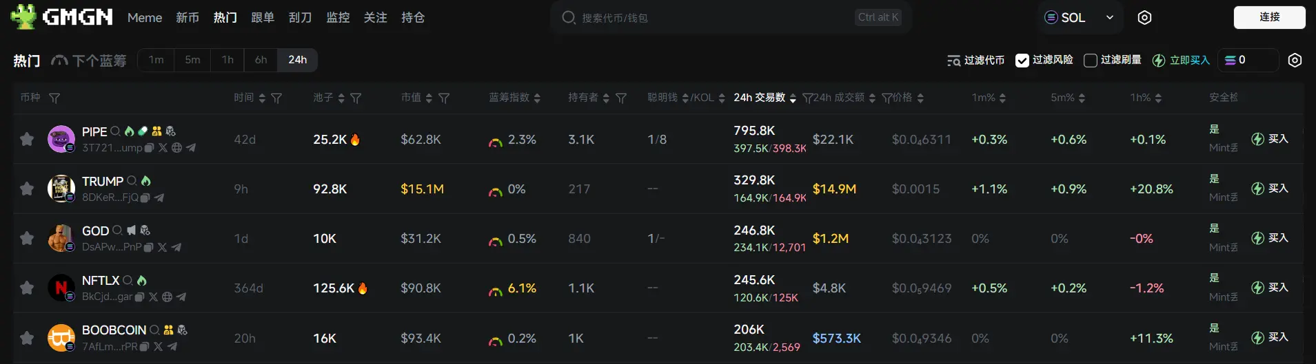 过去 24h Solana 热门代币前五依次为:PIPE、TRUMP、GOD、NFTLX、BOOBCOIN