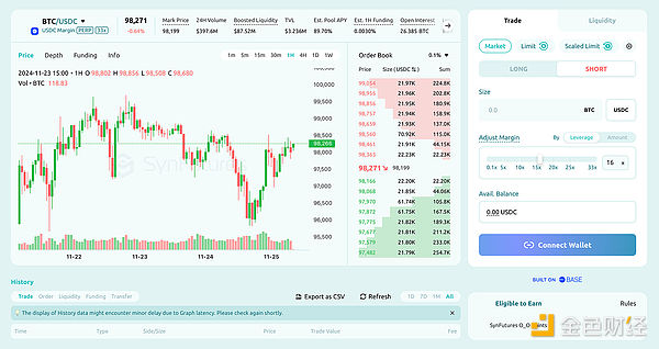 虽然流动性供给是以 DEX 式 oAMM 进行的,但在用户的前端体验上,SynFutures 还是订单簿。这一点能够满足衍生品用户的交易需求。