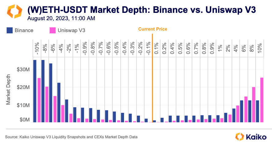 有了这些,让我们来看一下加密货币最具流动性的交易对之一,Binance 和 Uniswap V3 上的 (w)ETH-USDT 的市场深度。