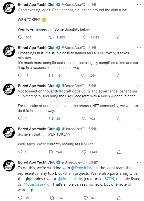 「什么时候发放 Token 是我们在社区常被问到的问题。首先,要知道,上传一个 ERC-20 的 Token 是非常简单的,只需要几分钟就能完成。但是如何构建一个合规合法的 Token,并且对其负责,让其可持续的发展,这才是最为困难的事情。更不要谈论说如何使用和治理 Token,我们需要为 BAYC 的社区成员带来收益的同时,也要将 BAYC 的经济体系带到更广泛的视野中。为了我们的社区成员和更为宽广的 NFT 社区,这才是我们要做的事情」。