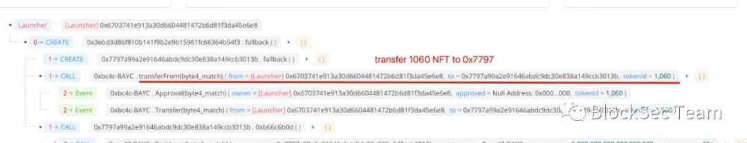 攻击者购买了编号 1060 的 BYAC NFT 并且转移给攻击合约。这个 NFT 是攻击者花了 106 ETH 在公开市场购买的。