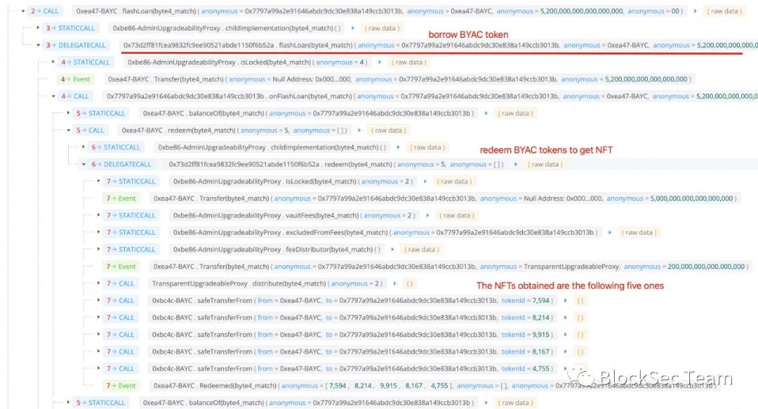 攻击者通过闪电贷借入大量的 BYAC Token。在这个过程中,攻击者通过 redeem BYAC token 获得了 5 个 BYAC NFT(编号 7594,8214,9915,8167,4755)。