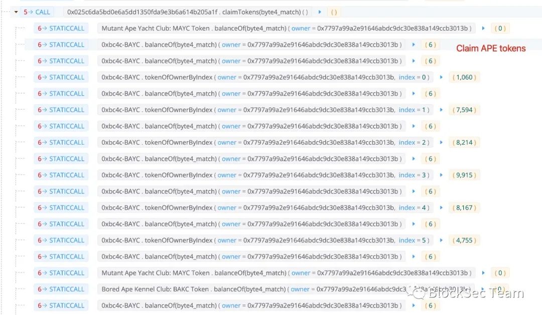 在这个过程中,攻击者使用了 6 个 NFT 来领取空投。1060 是其购买,其余 5 个是在上一步获得。通过空投,攻击者共计获得 60,564 APE tokens 奖励。