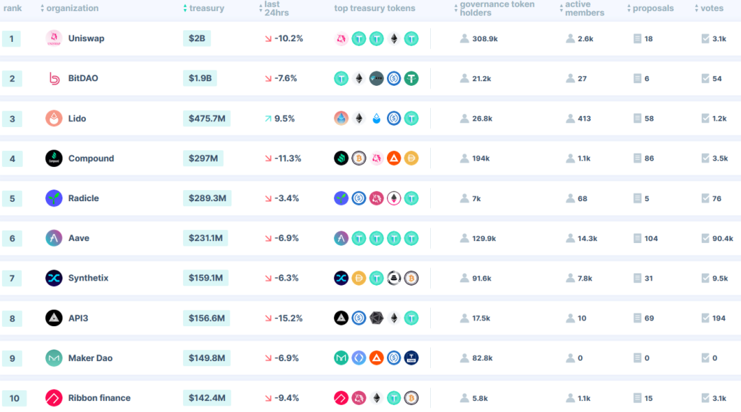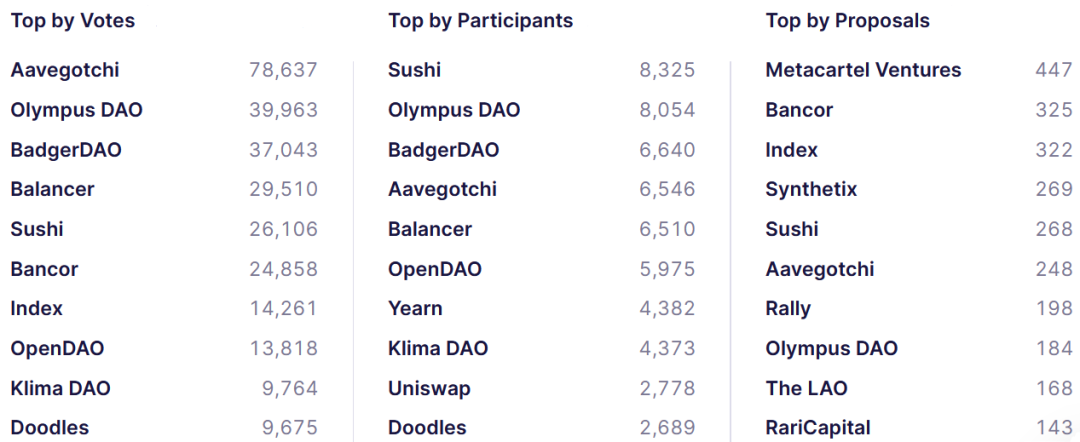 活跃提案:Aave、Compound、GitcoinDAO、Idle、Index Coop、LidoDAO、PieDAO、Uniswap