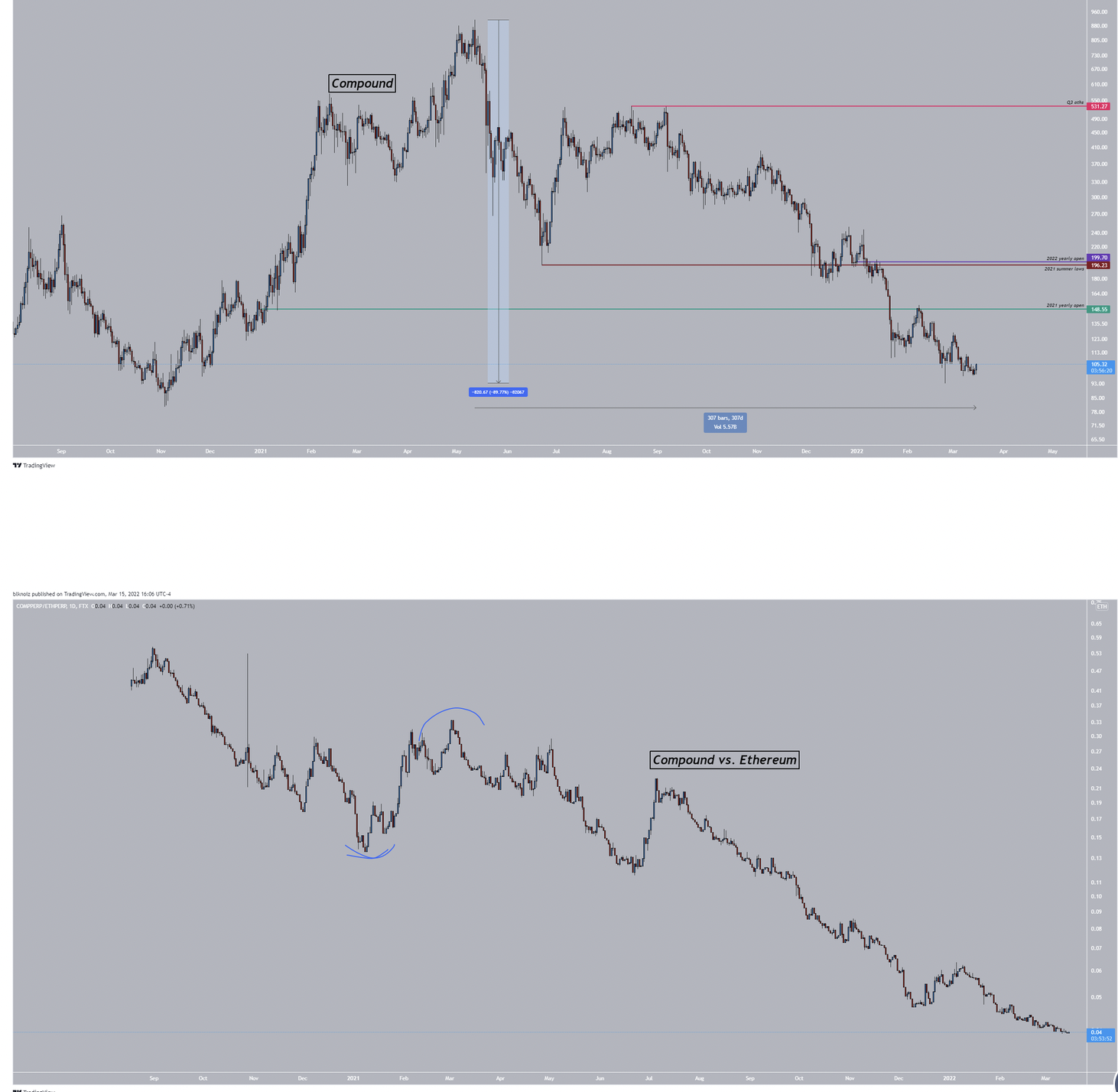 - COMP和许多其他 “DeFi蓝筹股 “在2021年第一季度首次上涨后也有类似的价格行动,更准确地说,它们中的大多数在2020年8月左右达到ETH的顶点,所以几乎是一个两年的熊市。