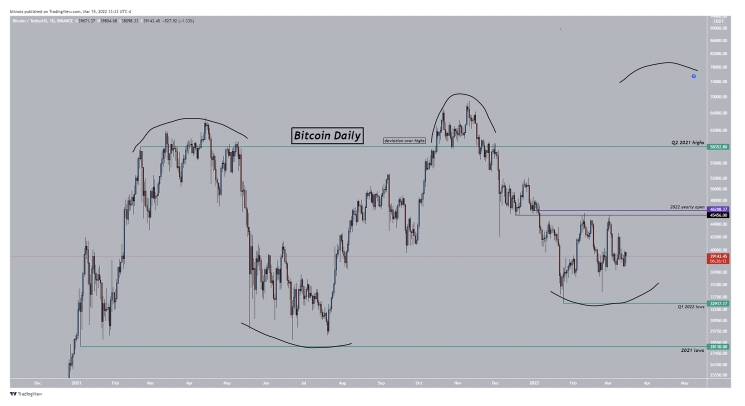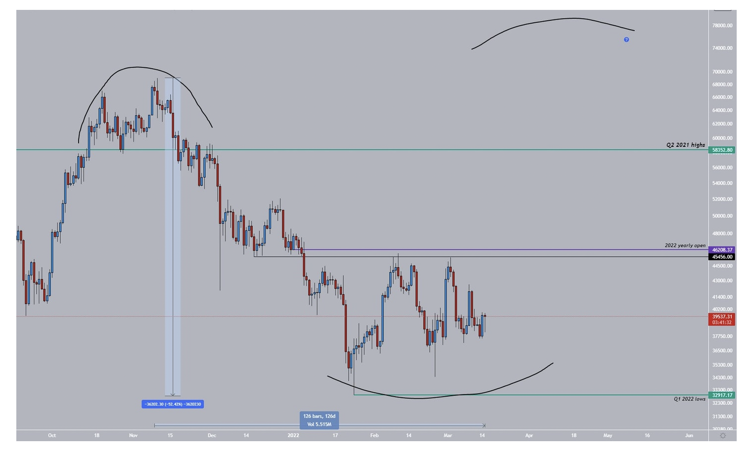 鉴于加密货币的相对优势,如果投资者对宏观条件的情绪改善,我预计加密货币将引领复苏。在本季度的整个过程中,我们一直在33k-45k之间徘徊,自从俄罗斯入侵乌克兰的那一天以来,我们一直没有创造新的低点,这也是许多像黄金这样的繁荣商品投入当地高点的日子。在我眼里,比特币的30k-60k区间是多年的再积累,接下来的趋势将与它在2020年底上升到之前的2017年高点最为相似,问题是这种积累会持续多久。许多山寨币从第四季度的高点下跌了80%以上,一些山寨币已经完全回调到2020年底的牛市涨幅,但有些山寨币的恢复速度比其他山寨币快得多。在这里看涨是不受欢迎的,就像在11月看跌是不受欢迎的一样。我相信我们已经看到了今年上半年恐惧和不确定性的高峰,预计这些积累范围将在第二季度向上突破,由BTC和几个表现出色的山寨币引领。