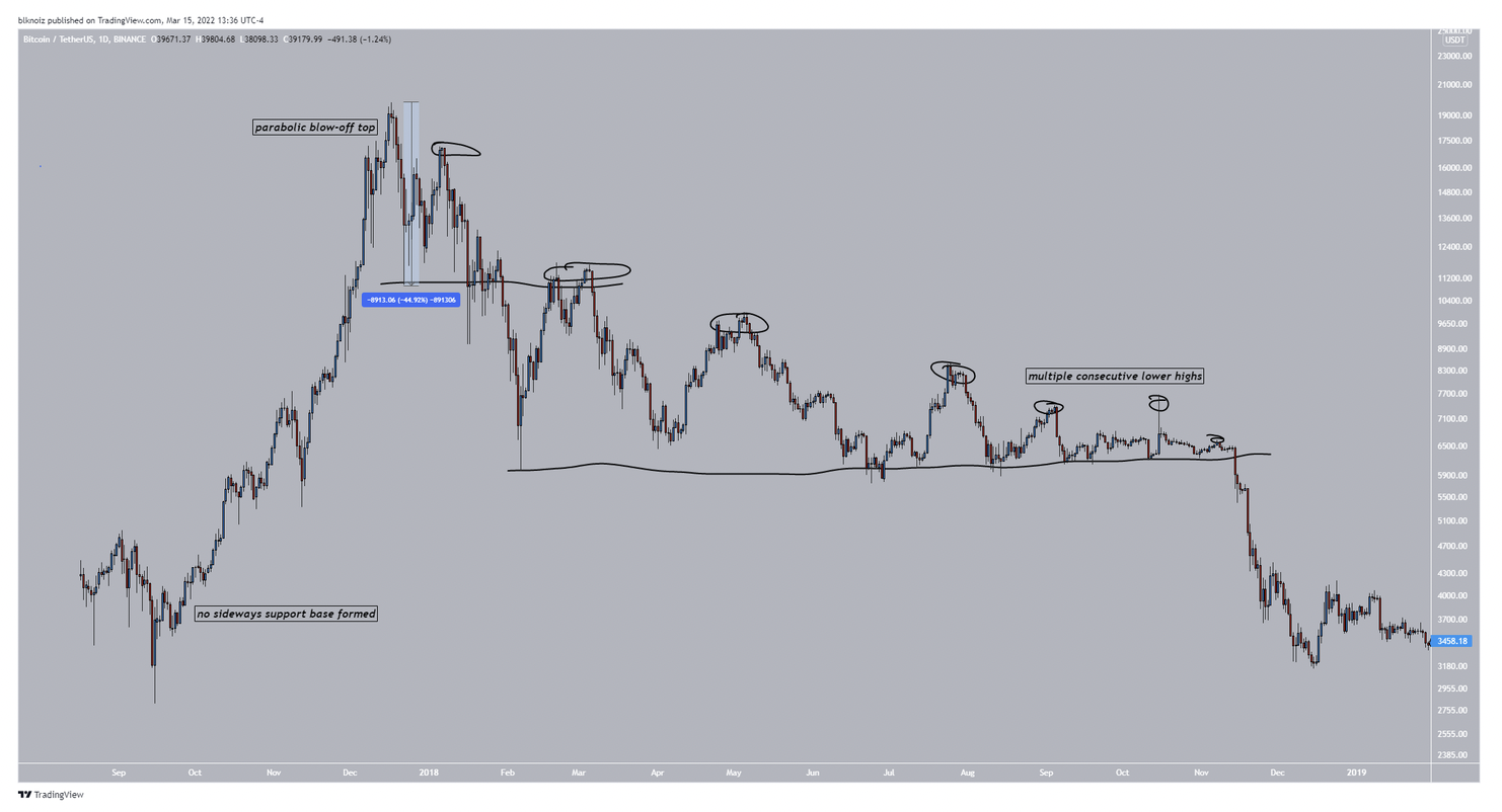 比特币正处于其第一次中年危机的中心。在其生命周期的大部分时间里,这个号称安全的数字黄金避风港,在其一生中的大部分时间都是作为风险资产与高增长资产一起交易的。如今在高通胀和全球冲突时期成为焦点。那么,它将如何表现呢?很多人说我蠢,因为我说鉴于历史时期BTC的抛物线式上涨和大幅下跌,BTC在不久的未来将不再作为高风险资产进行交易。在我看来,这在过去的两年里已经发生了变化。在历次BTC周期中,我们看到抛物线式的井喷顶部,然后是较低的高点+低点,直到时间线接近下一个减半,然后我们重新开始周期。相比之下,这个周期我们让比特币在2021年2月的高点附近交易了好几个月,然后在5月抛售,随后在夏天重新积累,并在2021年第四季度重新测试年初的那些高点。我们在这个区域建立了一个400多天的交易区间,不像2018年的价格行动是连续降低的高点。