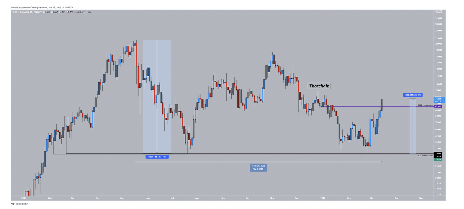 - 从 2021 年夏天开始到现在,还有另外一些山寨币测试了他们的底部,有一些反弹的比较厉害,RUNE有一些基本的催化剂(利好消息)帮助它,似乎现在时机很好(指买入时机)。
