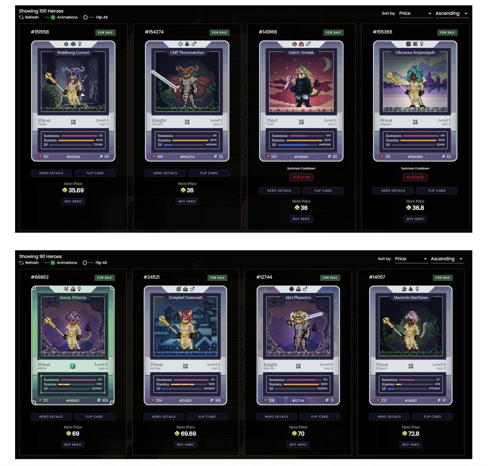 积极投入到游戏竞争中的玩家将被激励在游戏中购买和使用代币,这是严格意义上的DeFi产品永远不会存在的现实。我们还没有看到一个足够有趣的游戏在系统内有长期持续的玩家,但如果一个游戏能够创造一个像这样的生态系统,它让用户有能力通过积极玩游戏来增加他们的收益。DFK是我见过的最接近的例子,这也是我长期看好DFK的原因之一。DFK生态系统中的一个例子是酒馆中的英雄和高等级英雄的不同价格。目前普通英雄的地板价是35Jewel,而拥有10/10召唤物的英雄的地板价是95Jewel,1级英雄的地板价是35Jewel,而6级英雄的地板价是69Jewel。在41,000名英雄中,总共只有90名6级英雄在市场上上市,而相比之下,1级英雄却有好几页。
