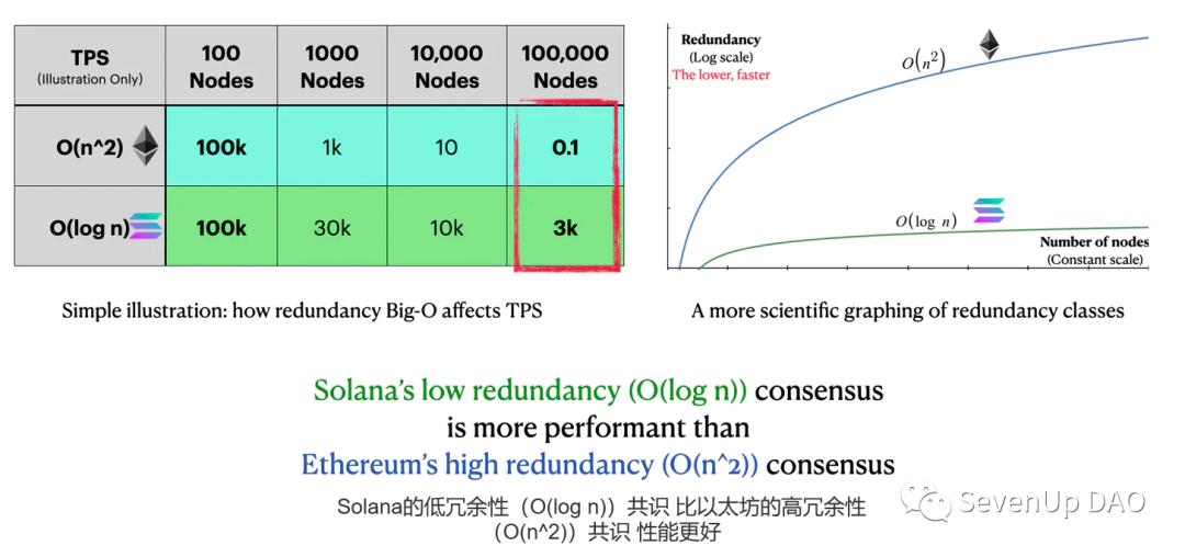- 但实际上 Solana 的 TPS 比以太坊通常的 TPS 要高 3000 倍。这另外 90% 的性能提升可以由我们讨论过的 Solana 的并行运算和降低冗余性的设计来更好的解释。