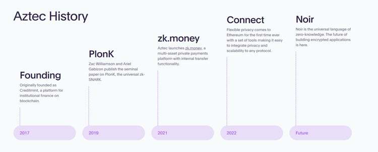 Aztec 最初是作为区块链机构融资平台成立的,后来转向开发 ZK 技术。它于 2019 年发布了PlonK,2021 年发布了zk.money,2022 年发布了Aztec Connect,并计划于 2023 年 Q2 推出Noir。